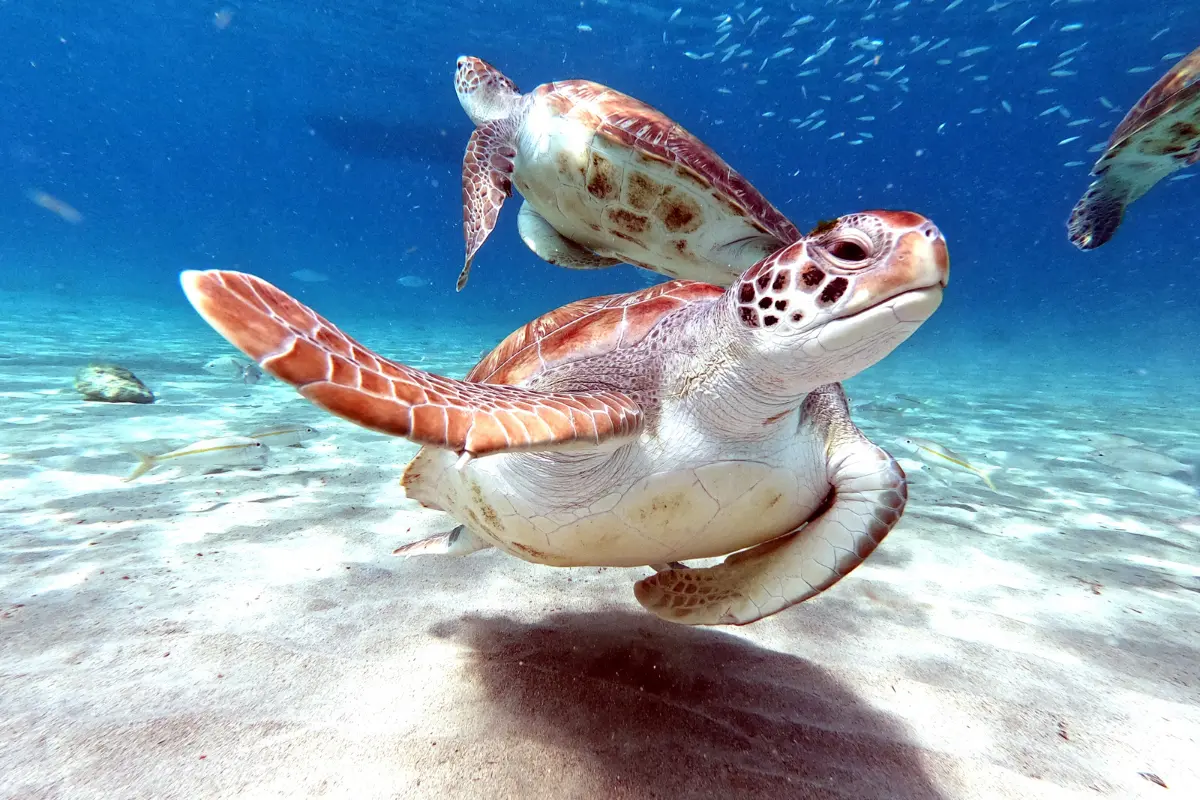 Gentle sea turtles grazing in seagrass beds